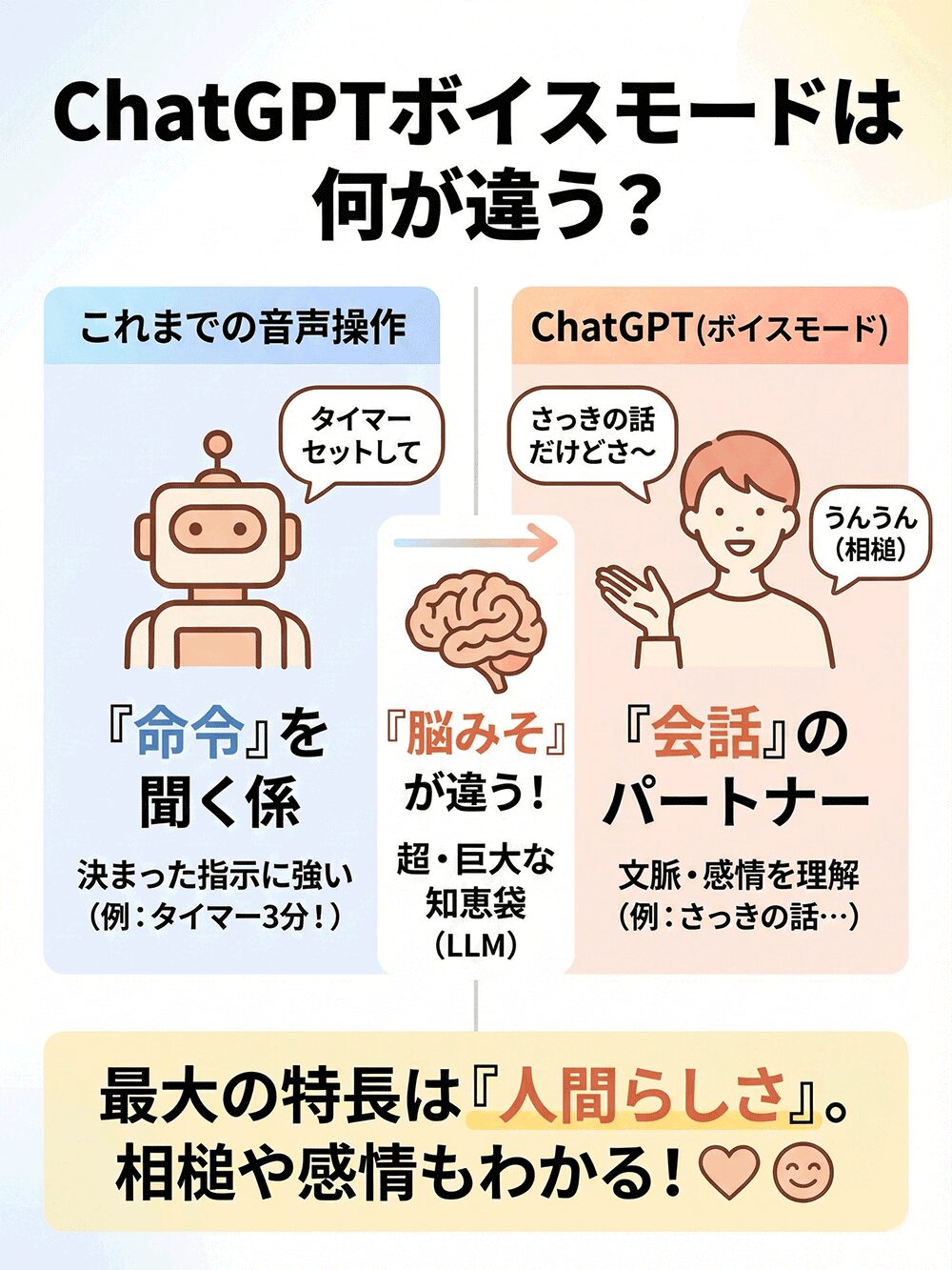 「スマホに話しかける機能なら、昔からあるじゃない」 そう思うかもしれません。でも、ChatGPTのボイスモードは、これまでの音声アシスタントとは「脳みそ」が違います。