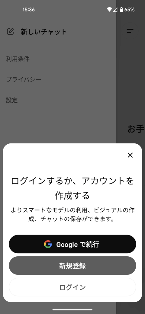 アプリを開くと登録画面が出ます。「Appleで続ける」や「Googleで続ける」を選べば、新しいパスワードを作る手間もなく、ワンタップで始められます。