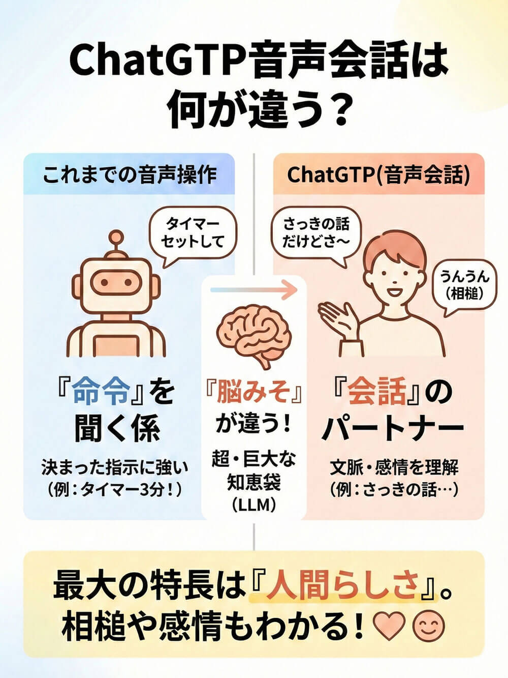 「スマホに話しかける機能なら、昔からあるじゃない」 そう思うかもしれません。でも、ChatGPTの音声会話は、これまでの音声アシスタントとは「脳みそ」が違います。